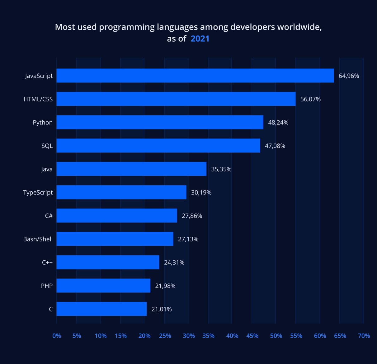 JavaScript (JS) — is the most frequently used programming language among developers in 2021. Created for development, improvement, and change of web and mobile applications. Many famous web applications and social media platforms such as Facebook, Google, Mozilla, etc are using JavaScript.